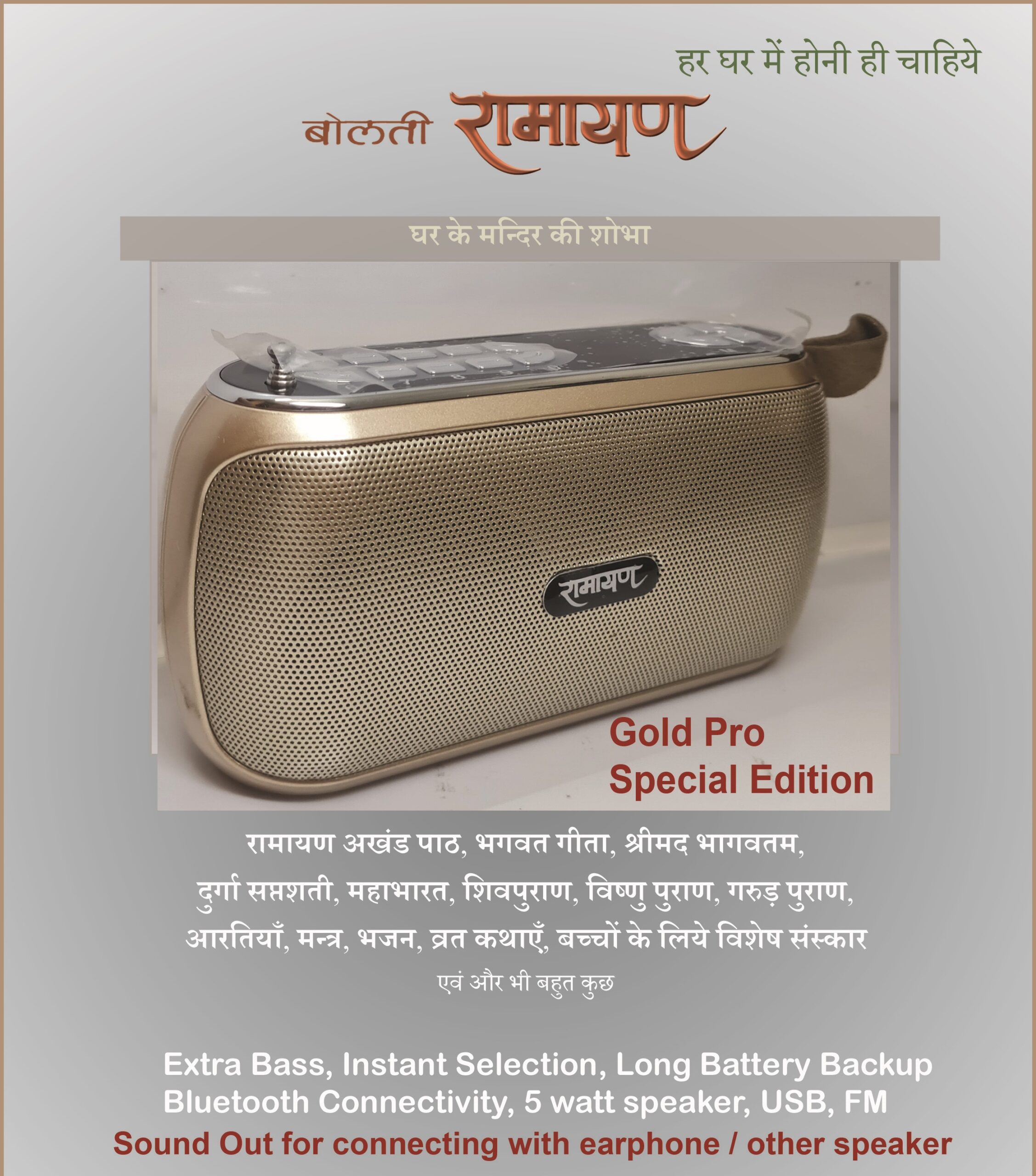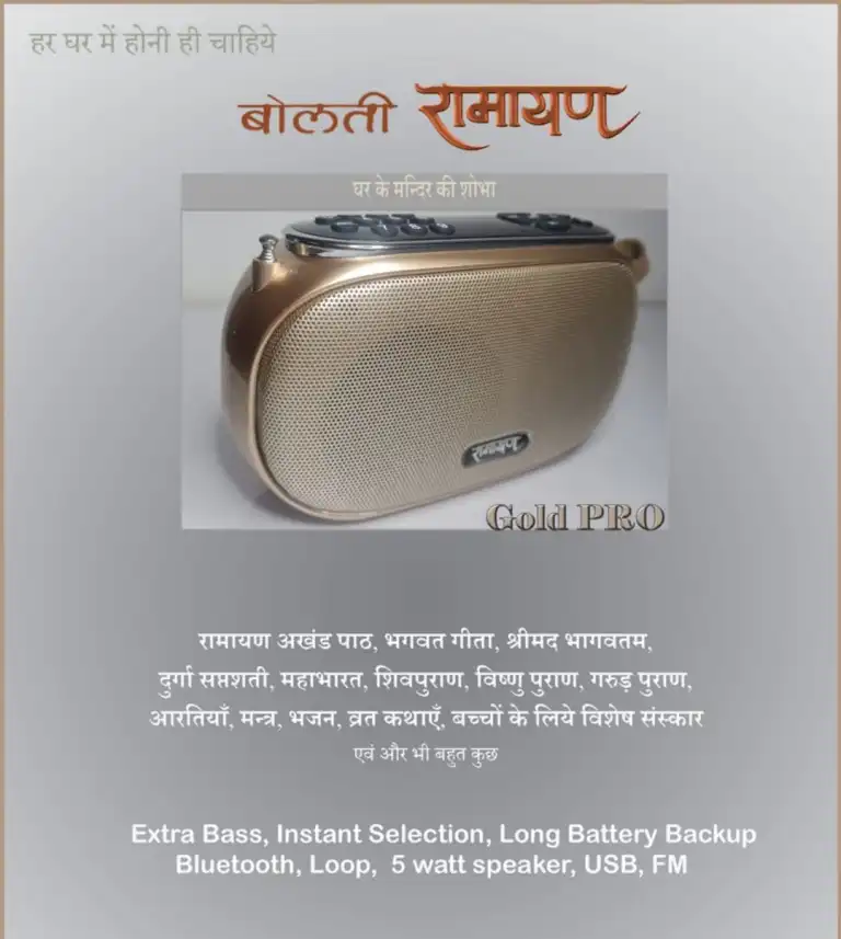 बोलती रामायण नाम की डिवाइस मैंने कल खरीदी जिसमें लगभग 298 घंटे के अलग-अलग अध्याय हैं जिसमें रामायण, महाभारत, भगवत गीता, विष्णु पुराण ,गरुड़ पुराण,विभिन्न आरती, भजन एवं अन्य सभी धार्मिक संग्रह है जो कि आज हमारे बच्चों को पढ़ना एवं सुनना अति आवश्यक है ।